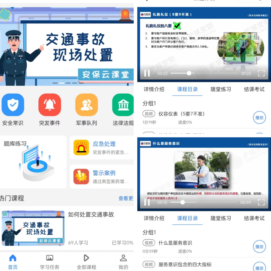 “安保雲課堂”小程序涵蓋了崗前培訓、安全常識、軍事隊列、法律法規、題庫練習五大學習版塊。學習版塊以文字和視頻形式呈現。視頻采用場景化直觀教學,激發學員學習與參與欲望。保安員證考試題庫版塊依據《保安服務管理條例》和《保安員國家職業資格評價培訓教程》傾心打造,題庫內容齊全且操作簡單便捷。公司的培訓課程分為線上學習和線下培訓兩部分,利用碎片化的時間學習更多的專業技能。
